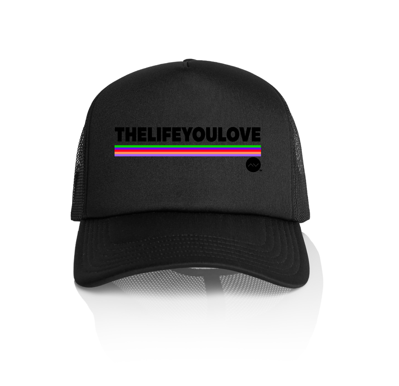Showcasing the AS Colour Frame Foam Trucker: A high-profile snapback cap with a curved peak, featuring a mid-weight construction with a 100% polyester foam front and peak, and a breathable 100% recycled polyester mesh back. Includes a plastic snapback closure, tonal under-peak lining, and tear-out AS Colour label for added comfort and customization.